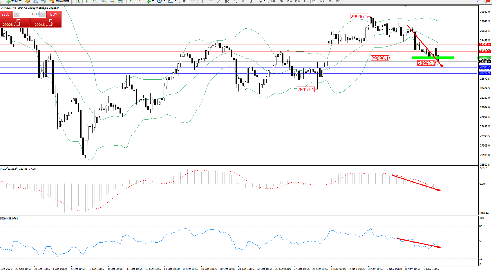 技术点评:空头动力延续布林带指标通道中下轨区间持续震荡下行,低位抵达28992位置后开始整理,短期空头动力有进一步向下移动态势,布林带指标呈缓慢张口走势后开始持续下行,MACD指标处于0轴线下方空头区域维持整理平移,RSI指标处于50均衡线下方空头区域维持窄幅整理中;