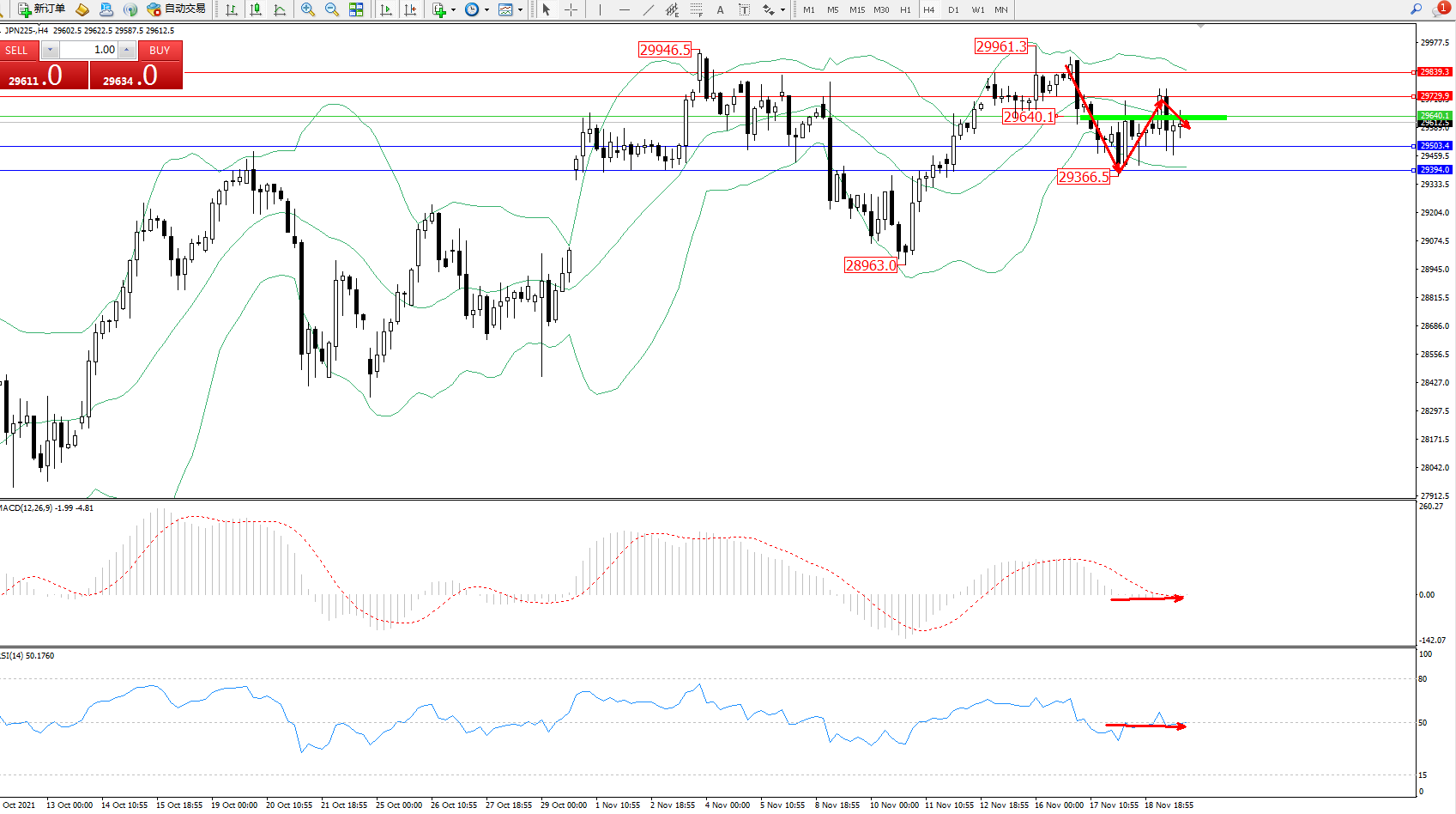 日经指数JPN225——4小时K线图显示: