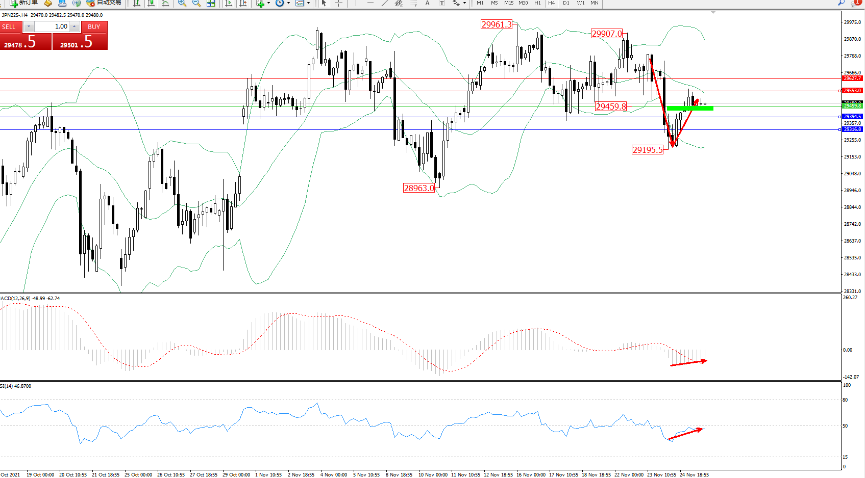 日经225指数11月25日(周四)收盘上涨223.84点,涨幅0.76%,报29526.50点。日本将配合美国为平抑油价而释放战略石油储备的行动,在不违反石油储备法的前提下释放国家过剩石油储备。日本专家认为,此次多国联合释放石油储备效果尚待观察。日本政府预计将首先释放420万桶,约相当于日本国内1至2天的需求量,后续可能根据需要继续追加释放量。日本能源经济研究所首席研究员小山坚认为,日本释放的仅是过剩储备,释放量有限。从增加供给角度来看,此次联合释放石油储备行动效果尚难判断。