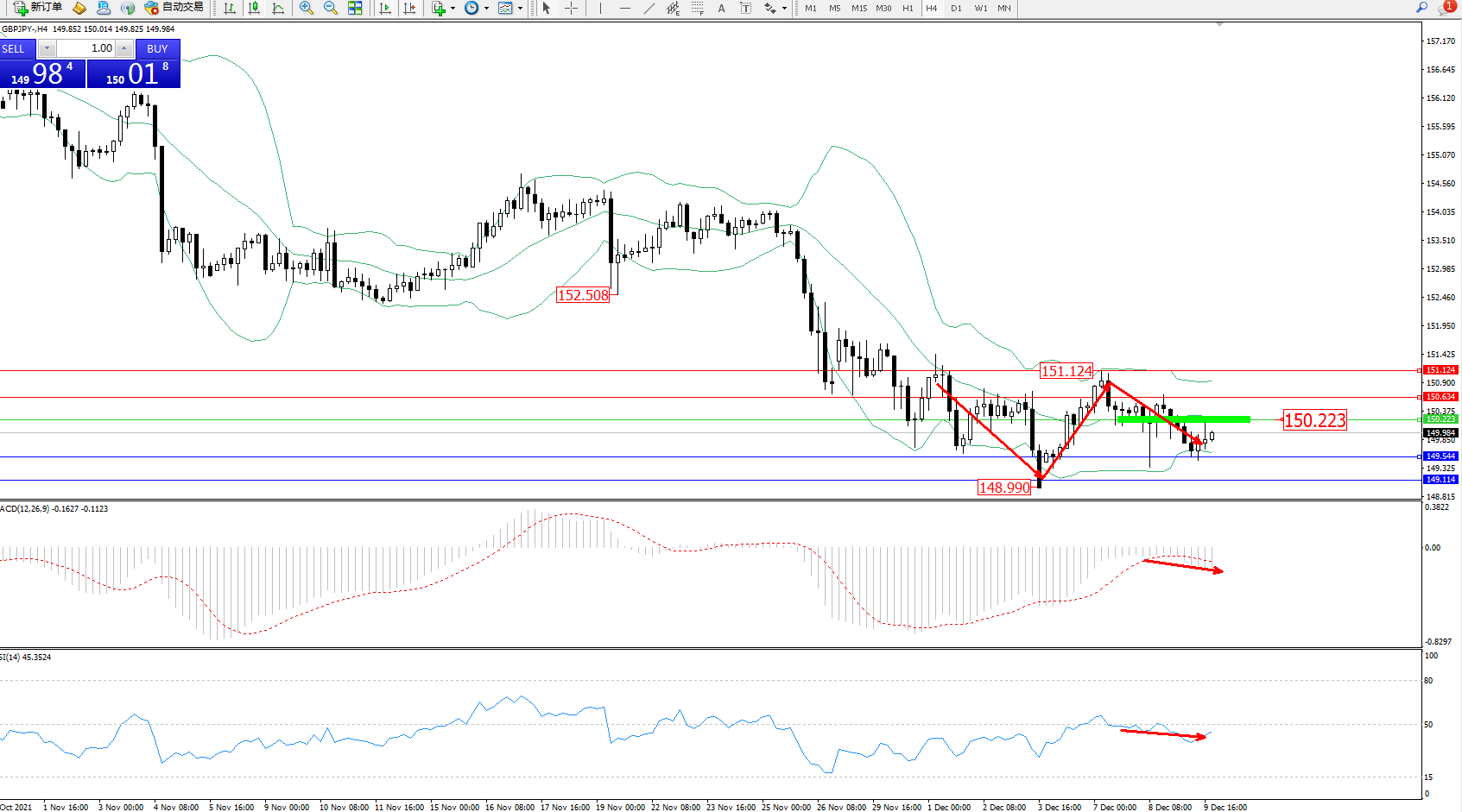 交易策略:150.223下方看跌,目标149.544、149.114