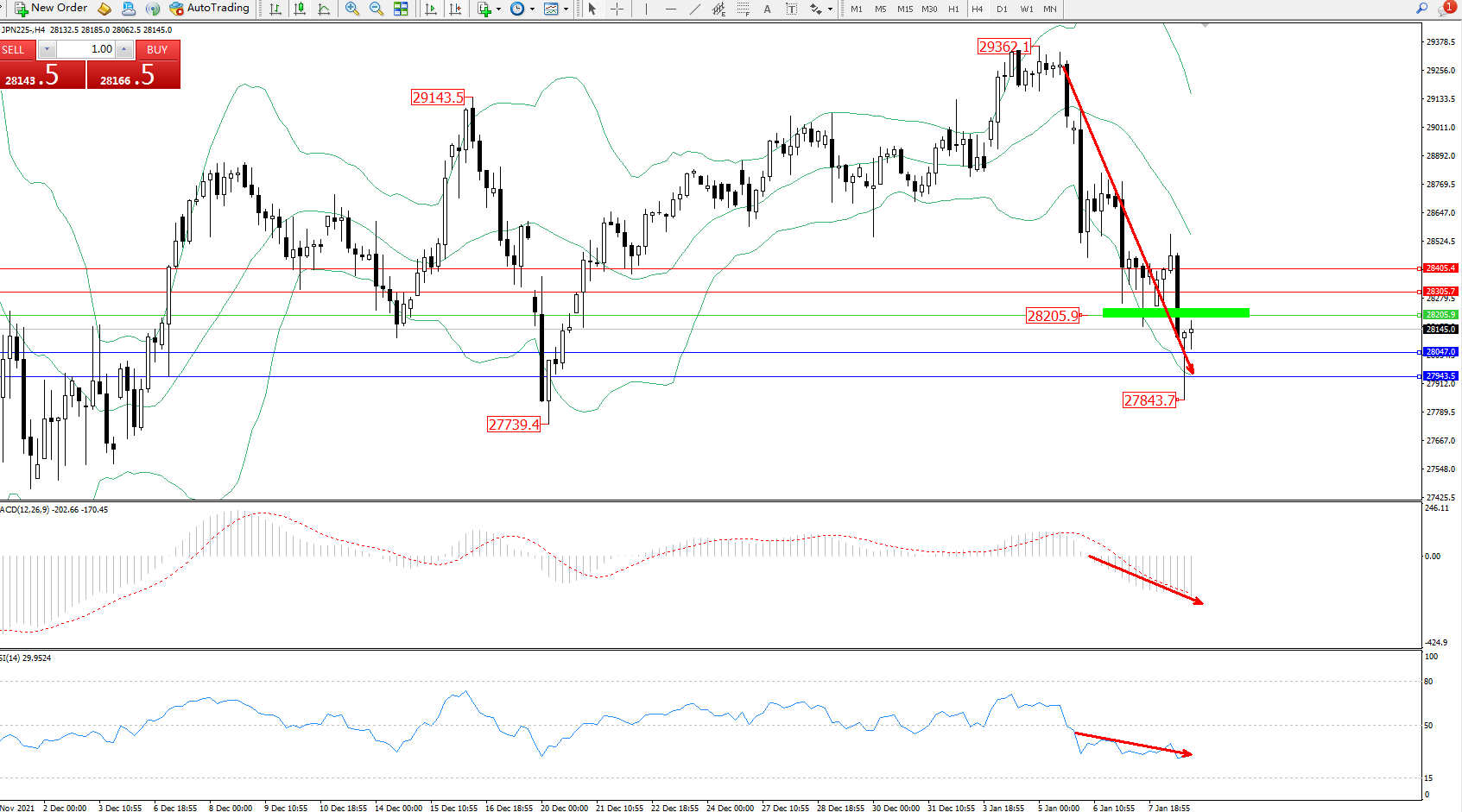 日经指数JPN225——4小时K线图显示: