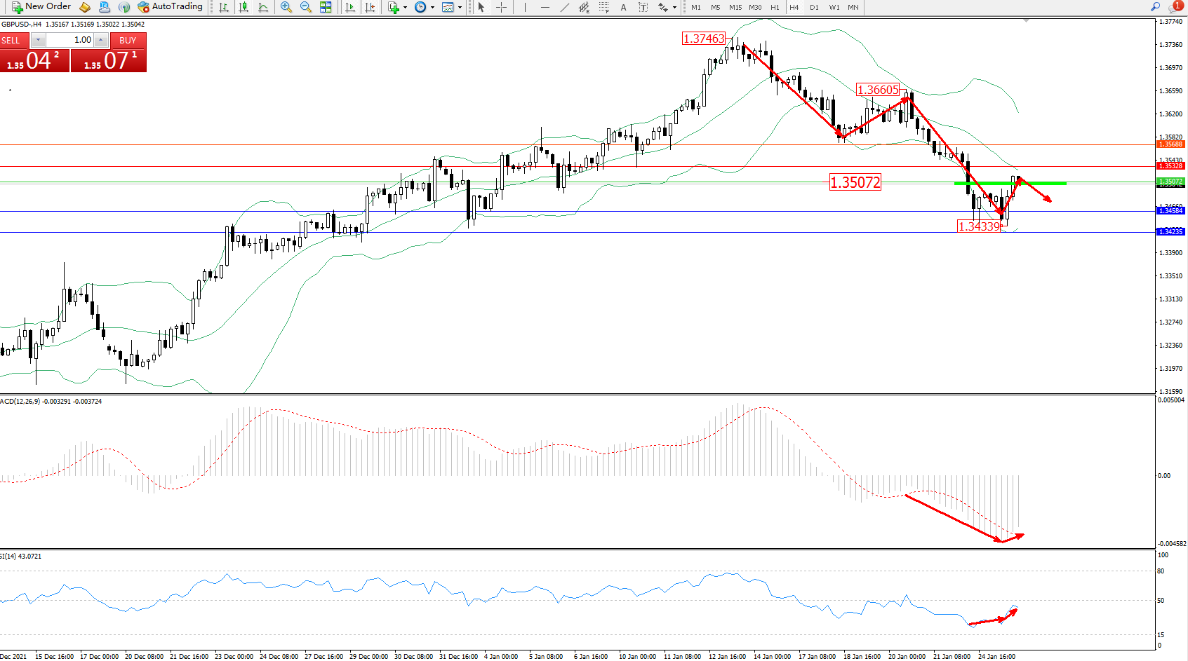 交易策略:1.35072下方看跌,目标1.34584、1.34235