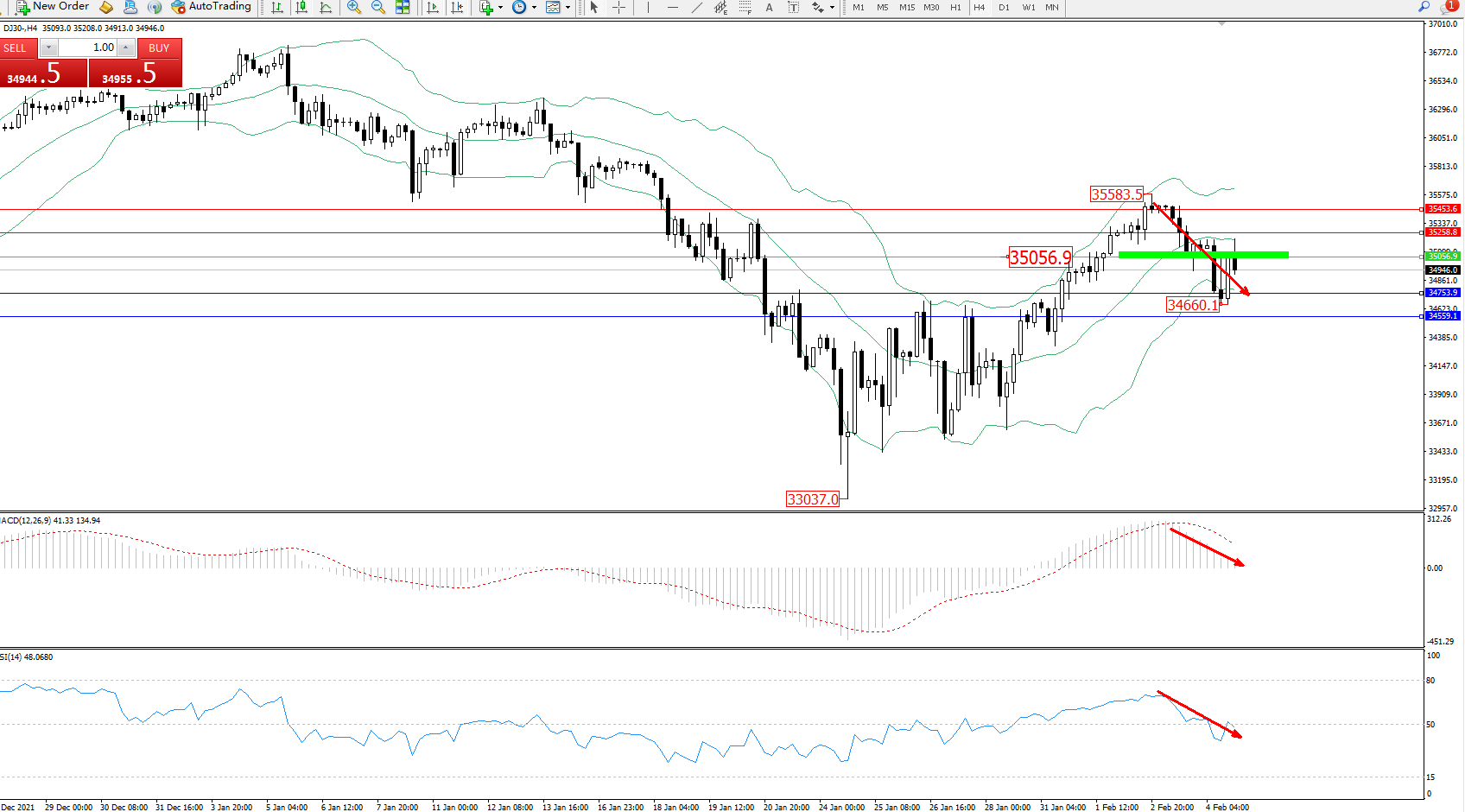 道琼斯指数DJ30——4小时K线图显示: