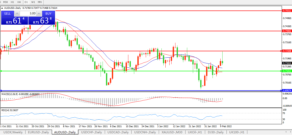 交易策略:0.7100上方看涨,目标0.7250、0.7400