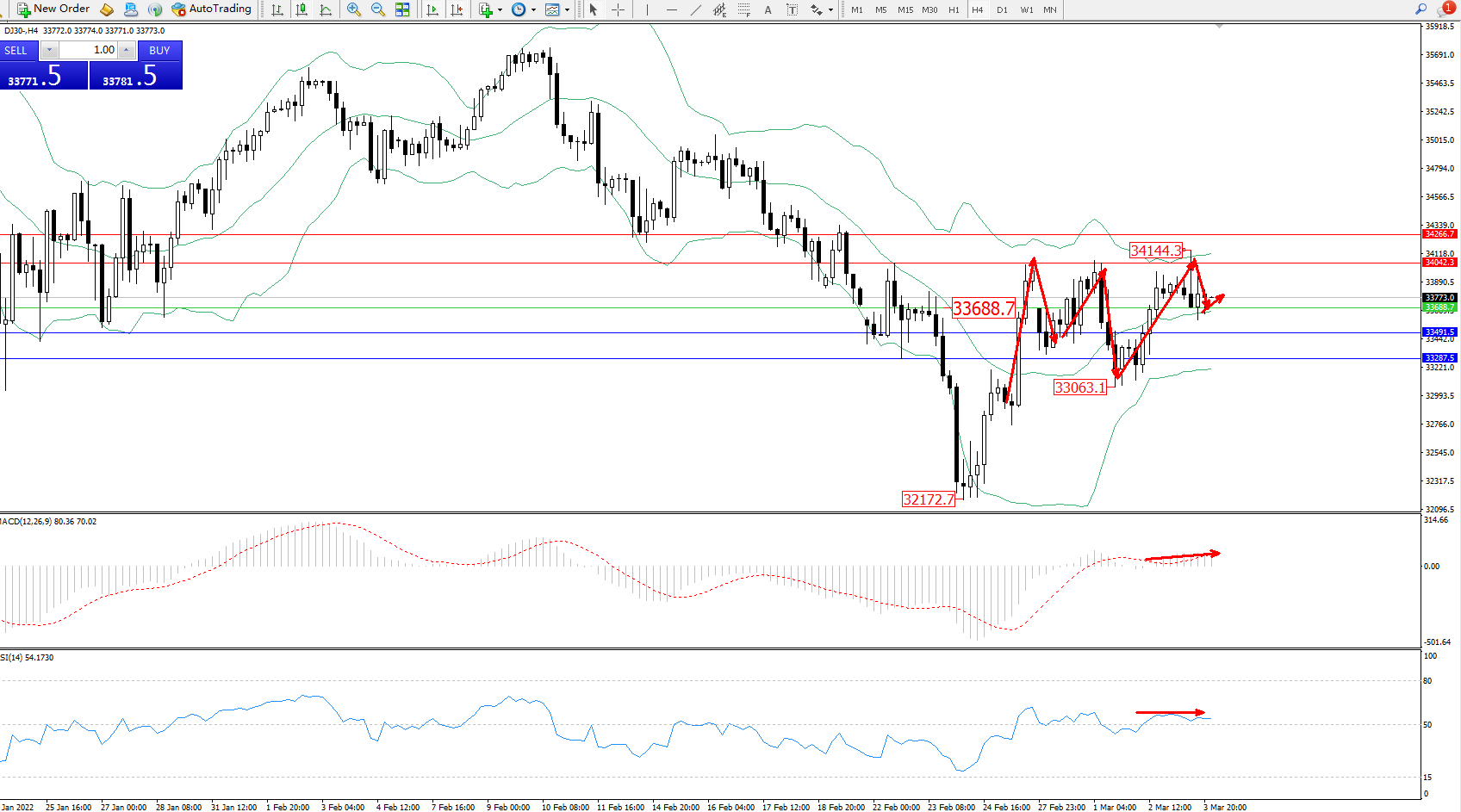 道琼斯指数DJ30——4小时K线图显示: