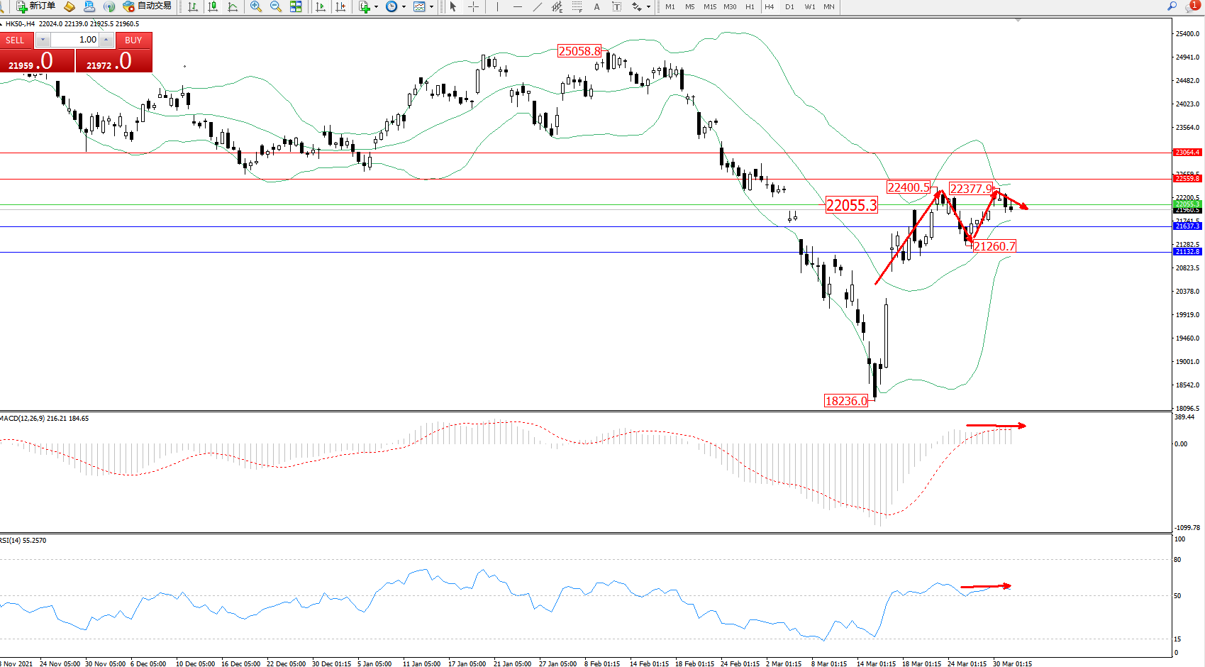 交易策略:22055下方看跌,目标21637、21132