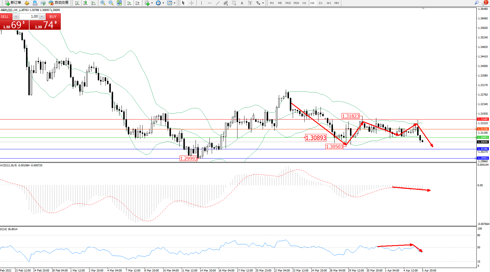 英镑美元GBPUSD ——4小时K线图显示: