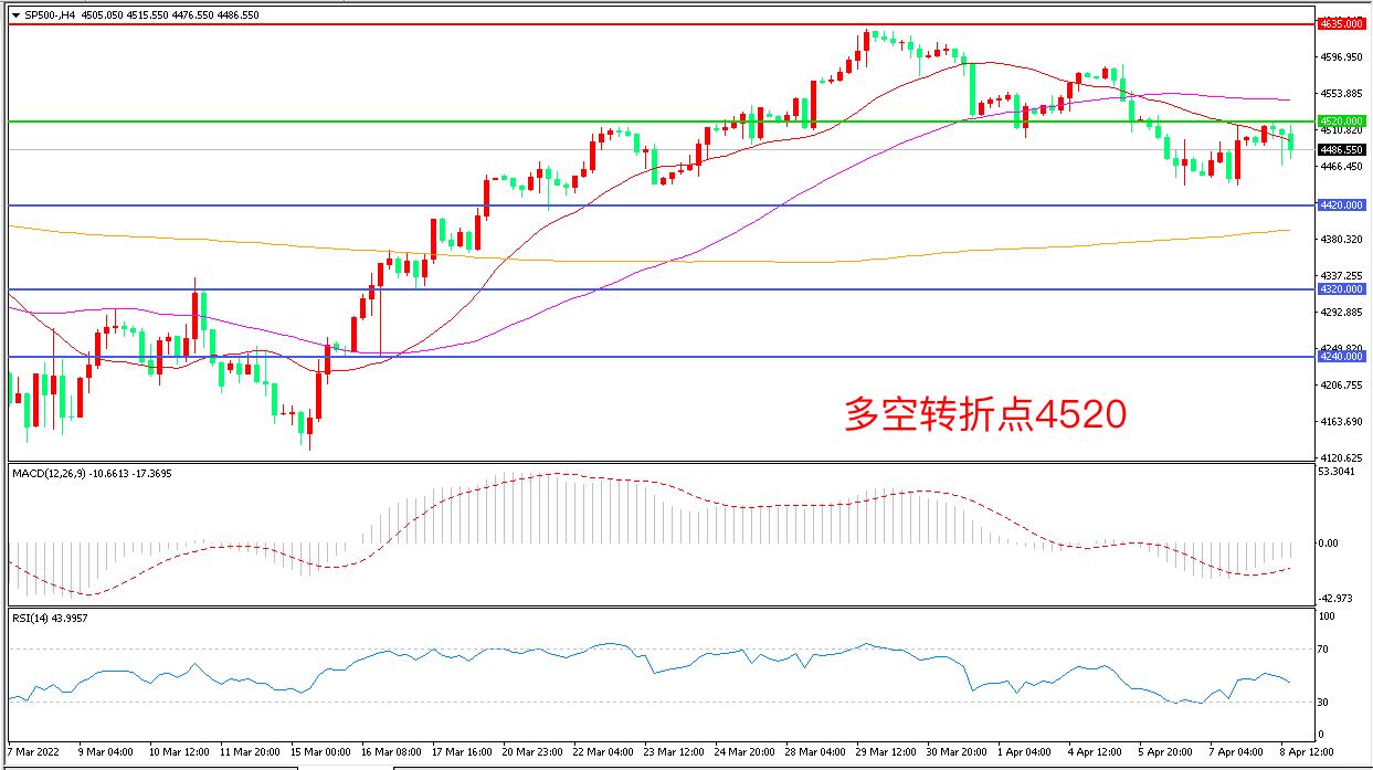 上周五(4月8日),白宫新闻秘书称,美国及盟友打算向乌克兰提供反坦克武器,俄乌局势紧张再度对市场形成打压,英伟达等芯片股和特斯拉为首的蓝筹科技股齐跌,标普500冲高回落,收报4486.55点。近期美联储表现愈发鹰派,紧缩的流动性对风险资产形成明显的打压,美股短期延续弱势震荡概率较大。