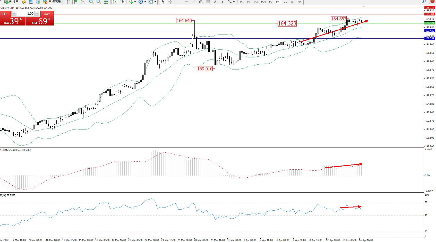 交易策略:164.323上方看涨,目标165.384、166.120
