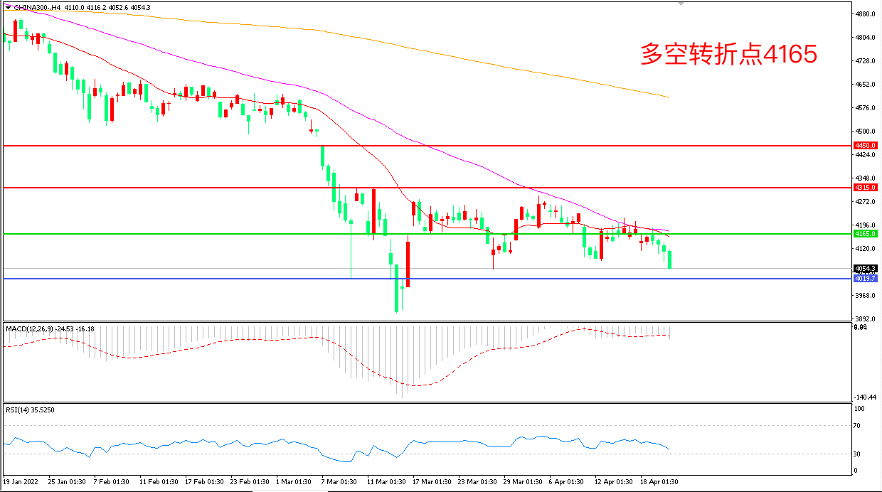 4小时图看,沪深300长阴连续下破,短期走势偏空,均线系统粘合成为上方阻力,4165成为多空分水岭,MACD绿柱增加,RSI指标向下,日内震荡下行概率较大。
