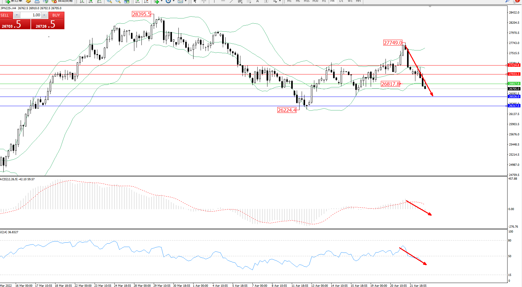 日经指数JPN225——4小时K线图显示: