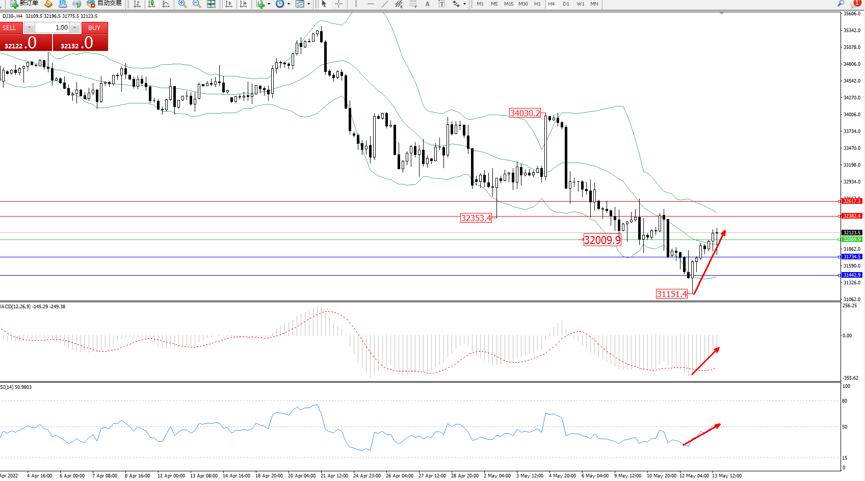 道琼斯指数DJ30——4小时K线图显示: