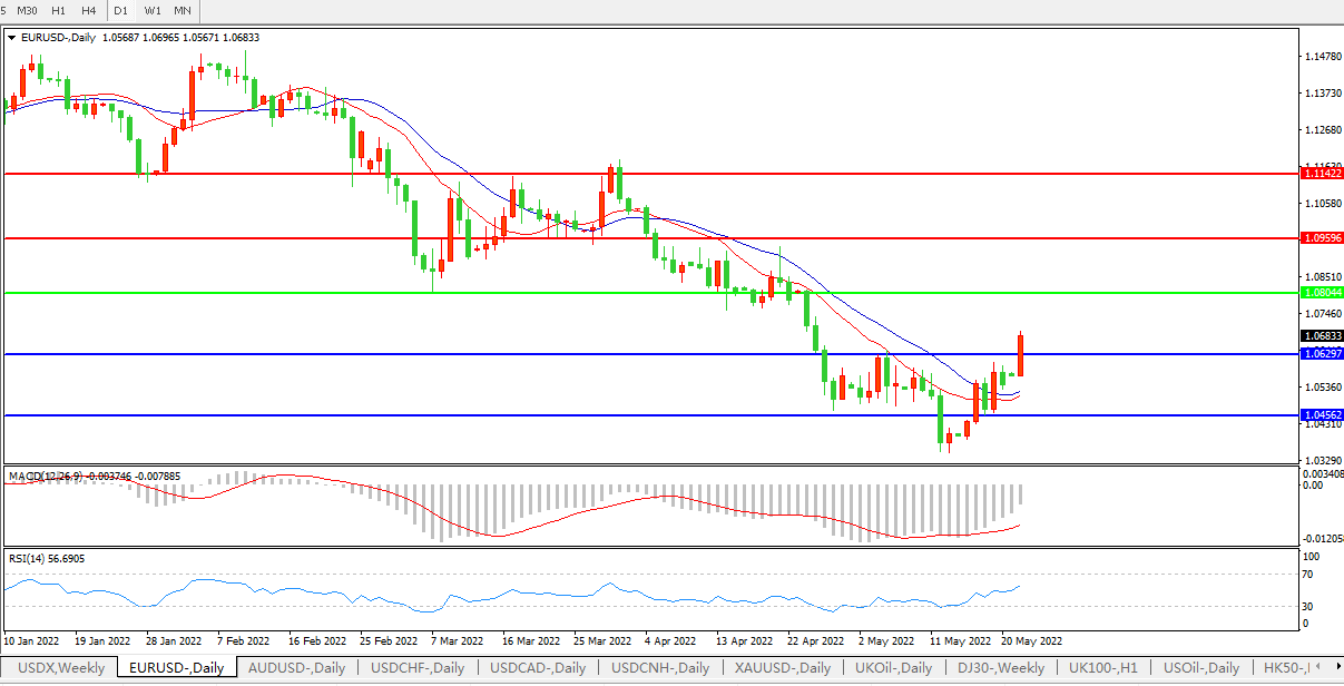 欧元/美元一度上涨1.2%,至盘中高点1.0697,为426日以来最高。欧洲央行行长拉加德的一篇博客文章强化了市场对该行将在7月开始加息的预期;与此同时,因全球股市上涨提振了风险情绪,令美元面临下行压力.