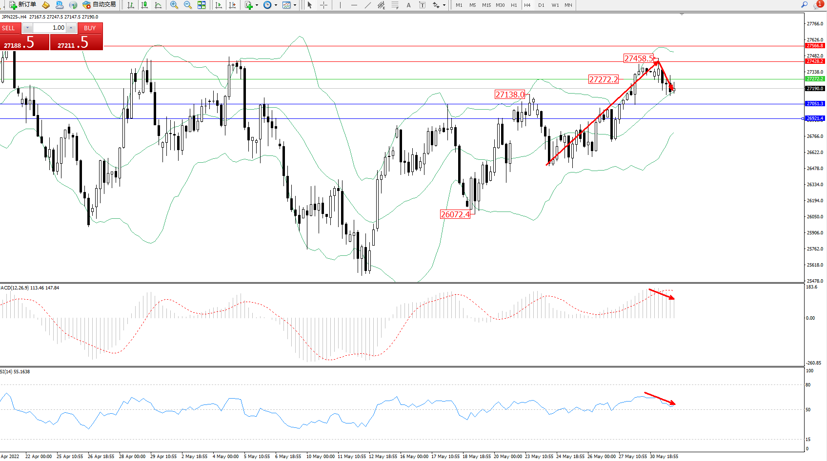 技术点评:多头动力延续布林带指标通道中上轨区间持续震荡上扬,高位抵达27458附近节点后开始回撤,短期你空头动力伺机入场,布林带指标呈收口走势中,MACD指标处于多头区域维持震荡回撤,RSI指标处于多头区域维持震荡缓慢下移;