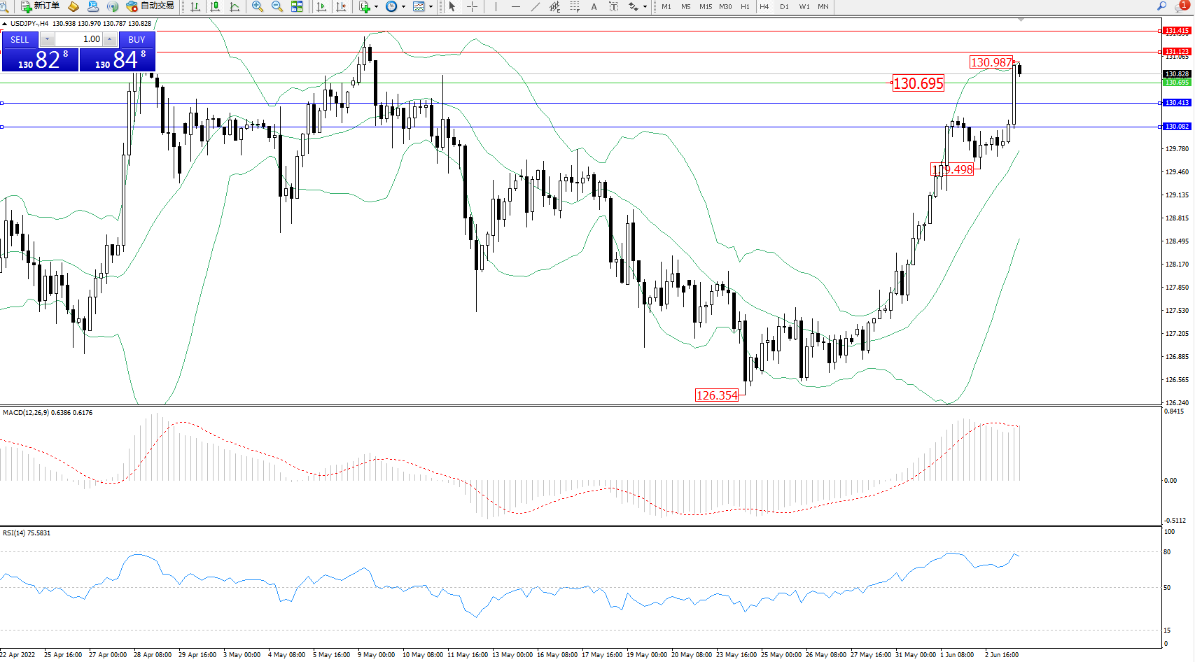 交易策略:130.695上方看涨,目标131.123、131.415