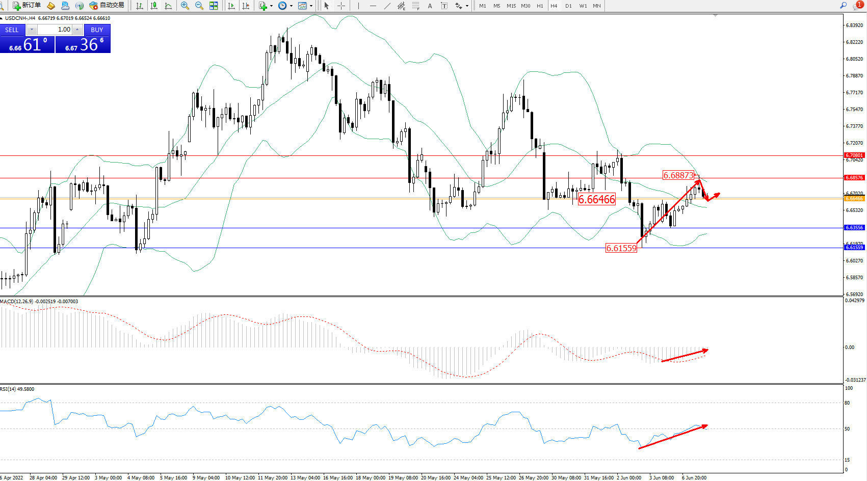 交易策略:6.66466上方看涨,目标6.68576、6.70801