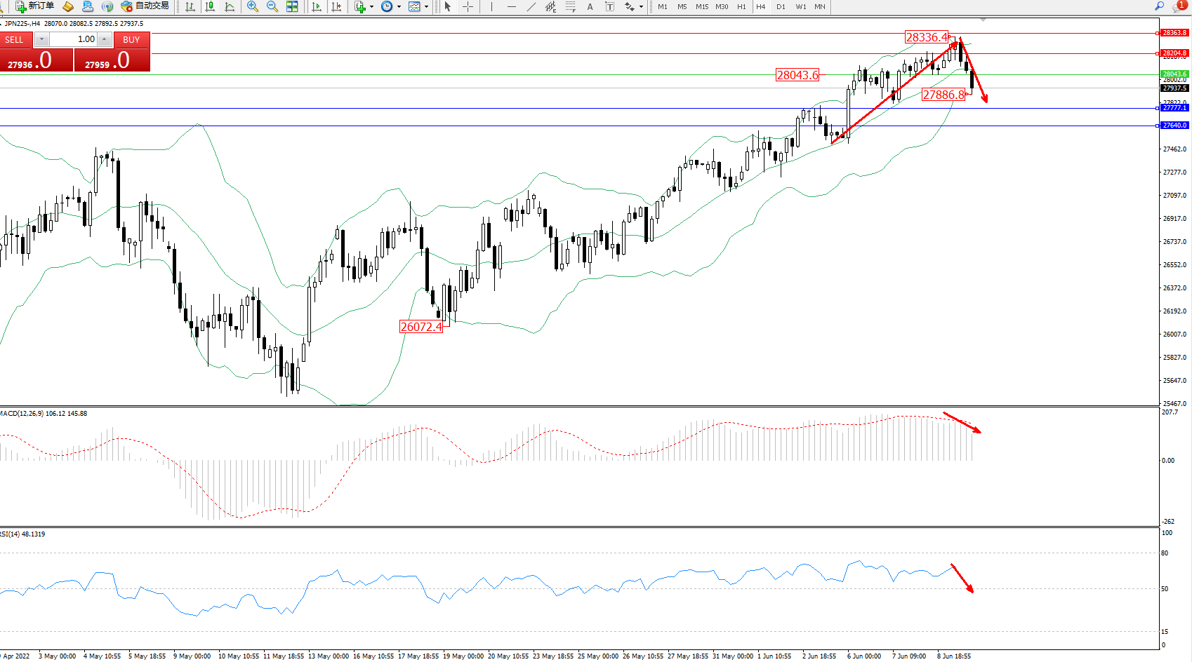 日经指数JPN225——4小时K线图显示: