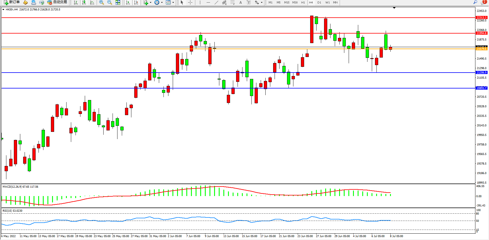 4小时图看:高位短期回撤震荡,多头动力再度拉升,MACD指标处于0轴线上側徘徊,RSI指标处于50均衡线上側窄整理;