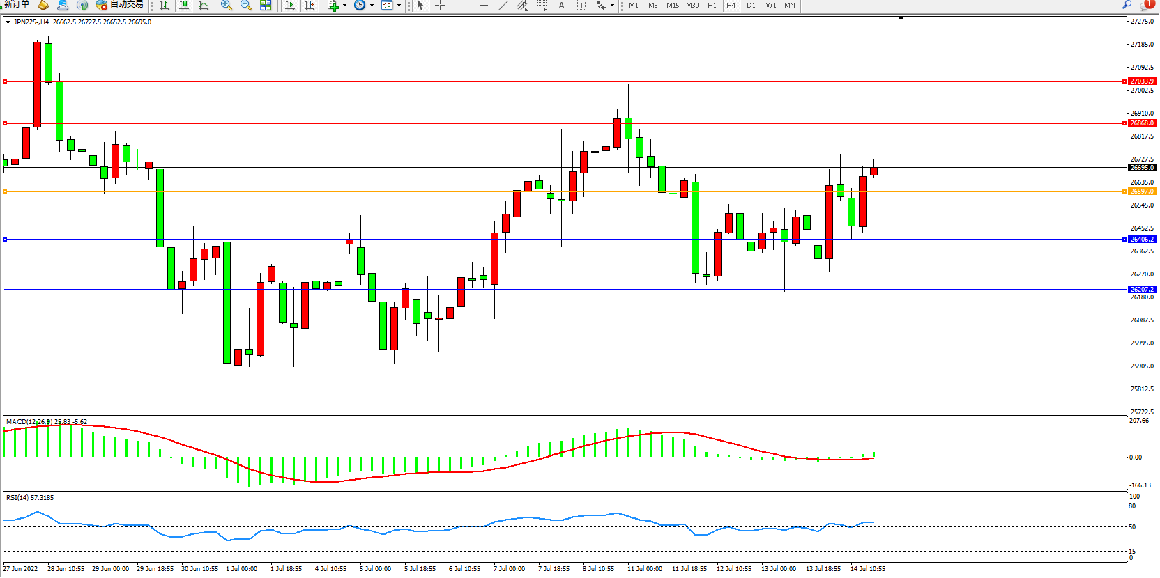 日经指数JPN225——4小时K线图显示: