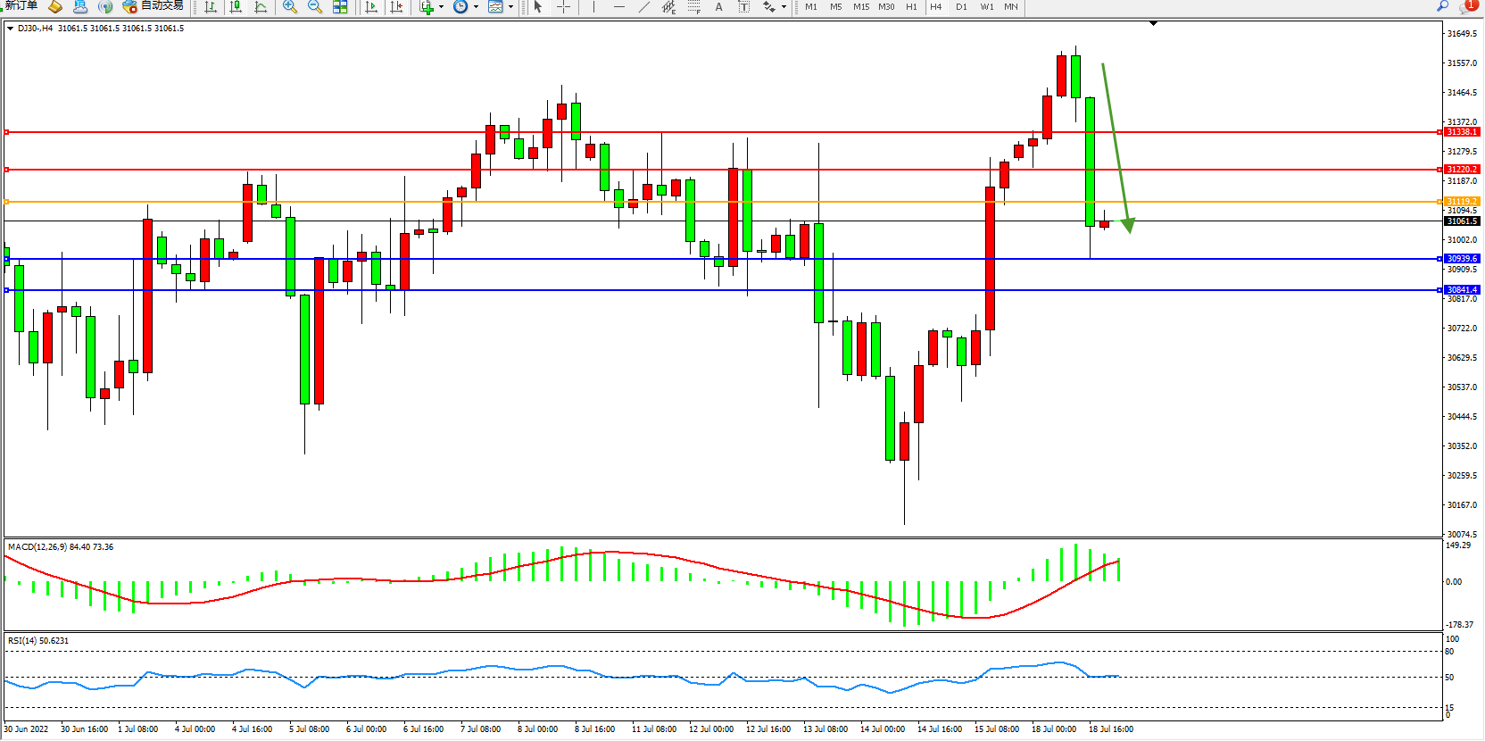 道琼斯指数DJ30——4小时K线图显示: