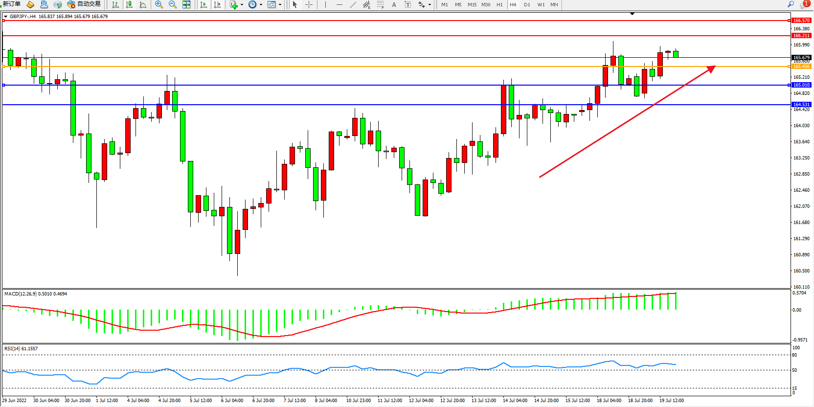 备选策略:165.456上方看涨,目标166.211、166.570