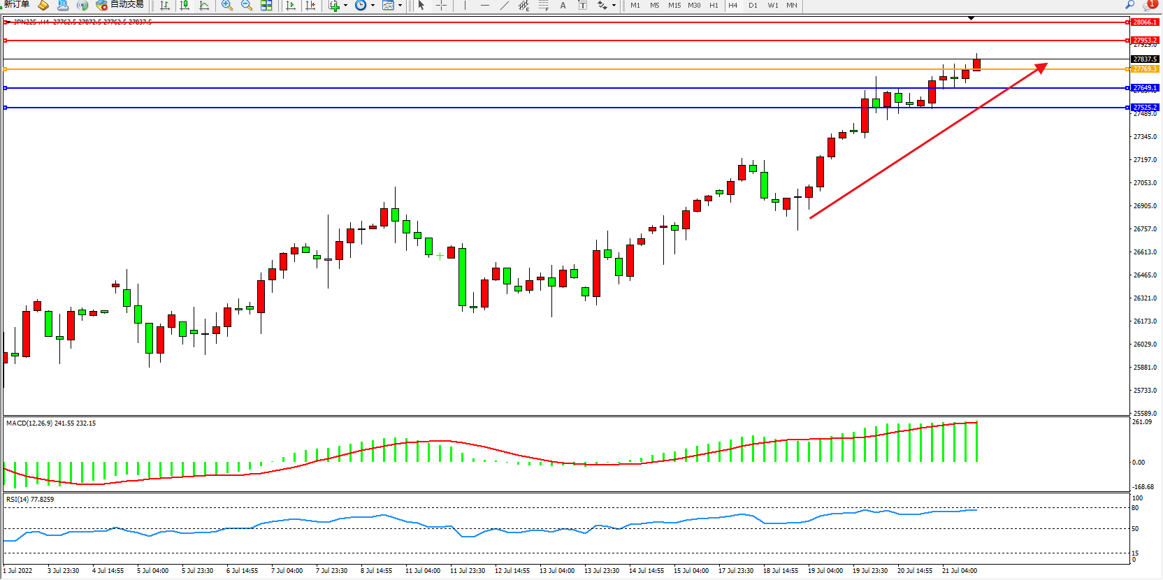 日经指数JPN225——4小时K线图显示: