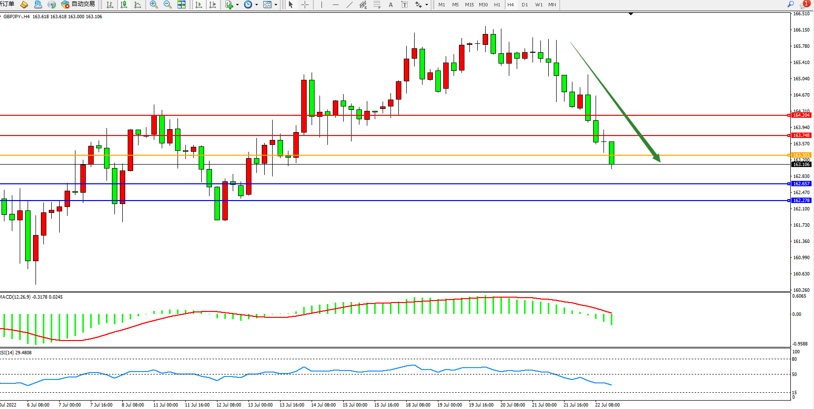 交易策略:163.303下方看跌,目标162.654、162.278