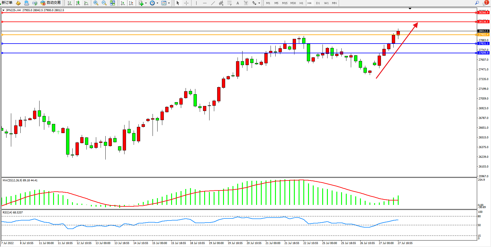 日经指数JPN225——4小时K线图显示: