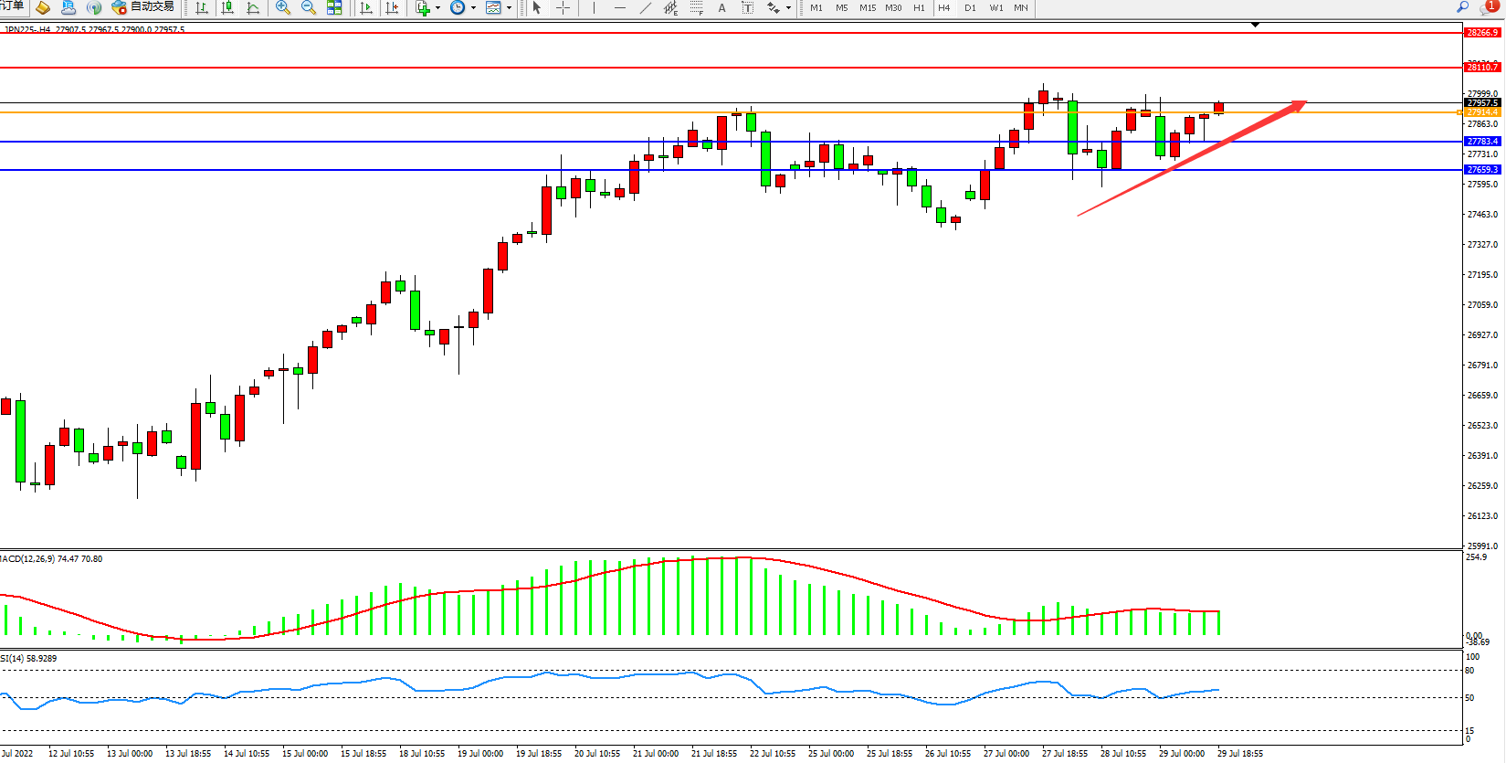 日经指数JPN225——4小时K线图显示: