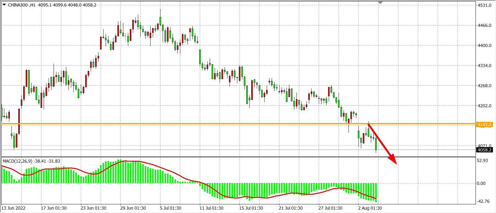 沪深300反弹4143后再度受阻明显,延续跌势,日内在该位之下继续看跌为主,同时MACD于零轴之下量能持续放大,预示行情进一步回探的风险,在4143之下看4050-4000