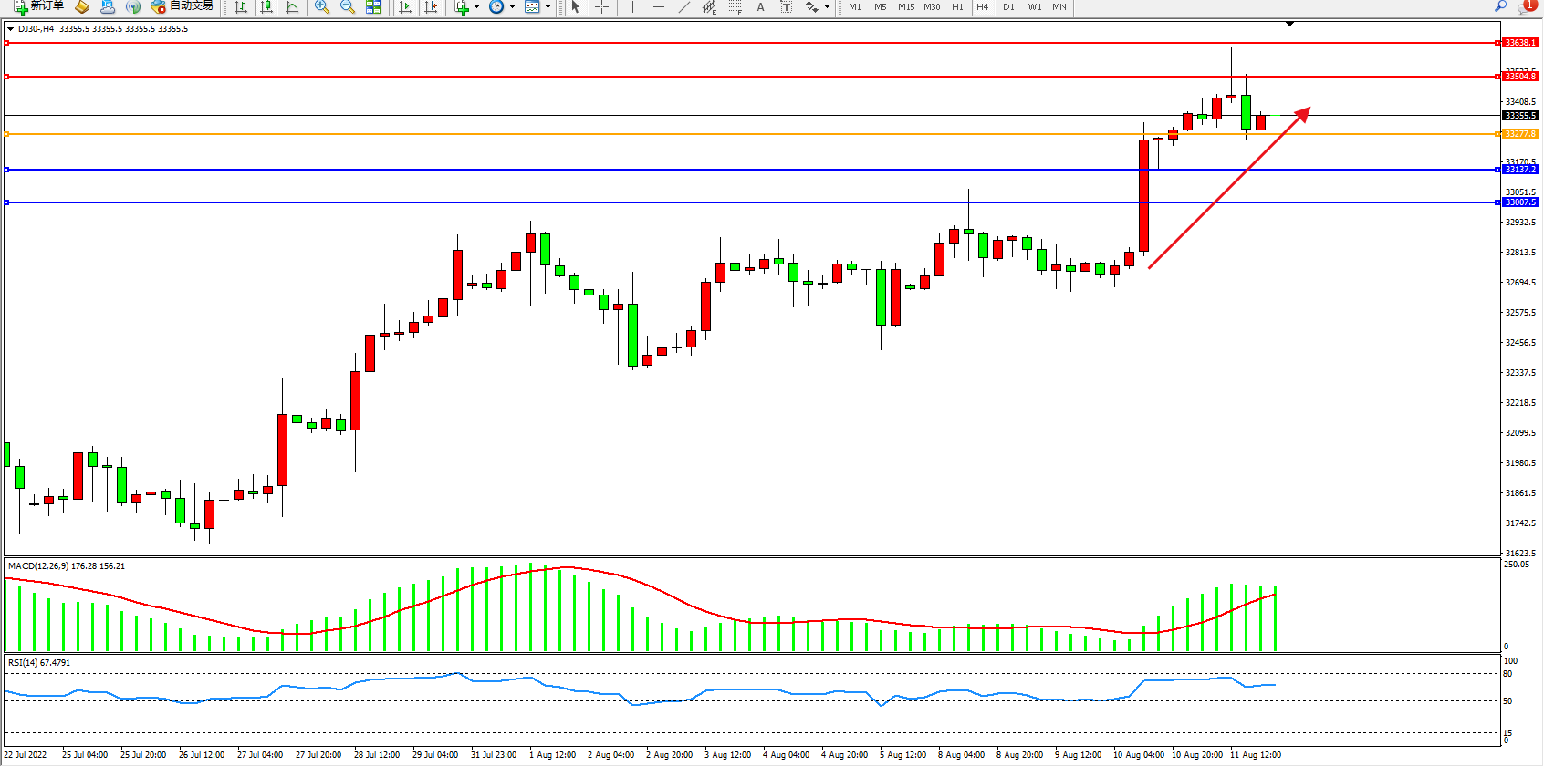 道琼斯指数DJ30——4小时K线图显示: