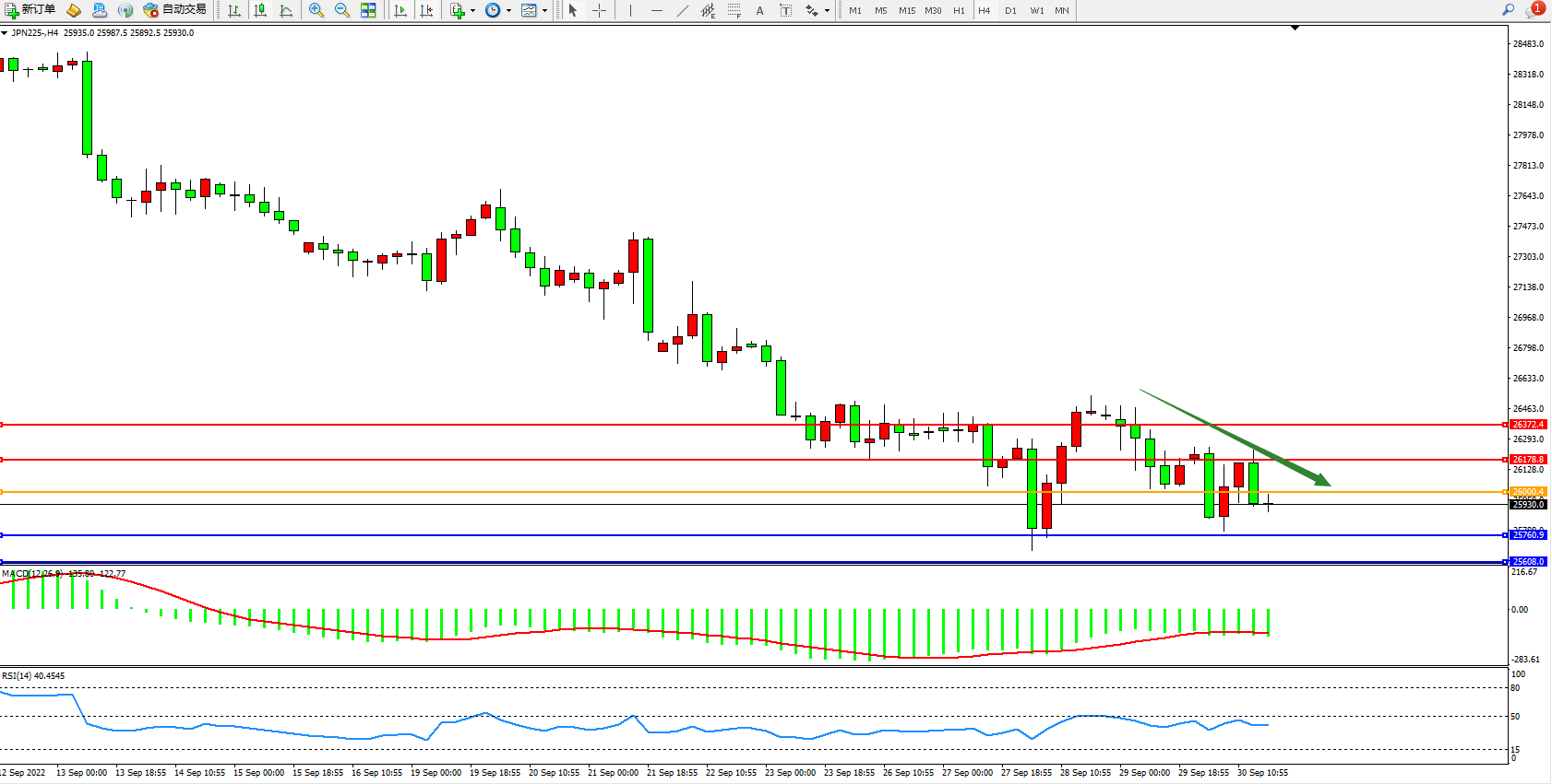 日经指数JPN225——4小时K线图显示: