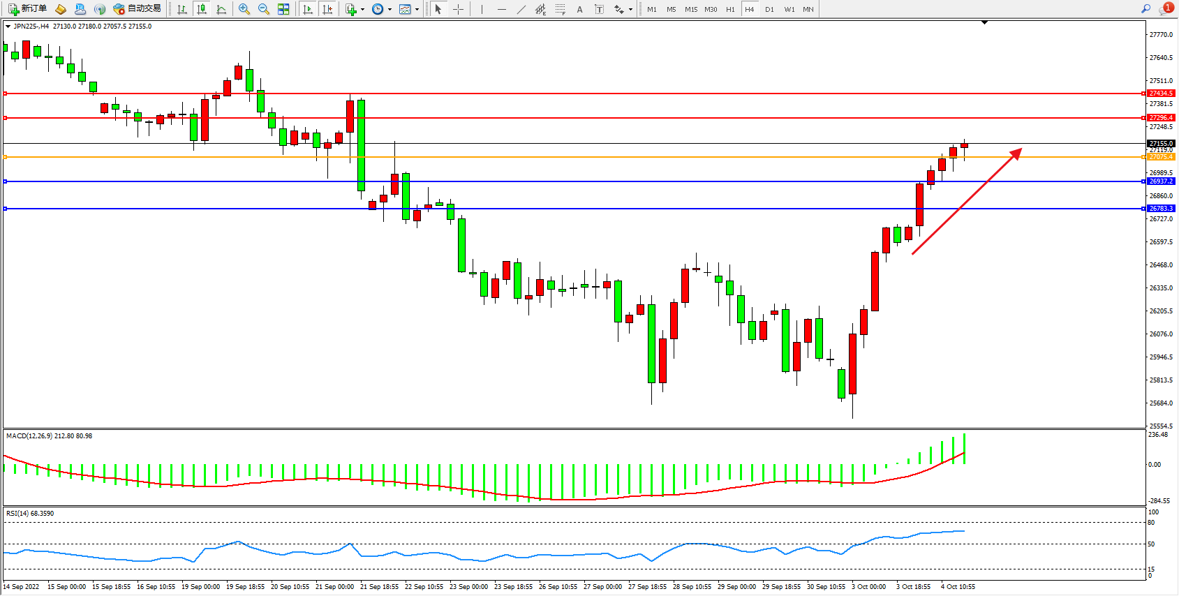 日经指数JPN225——4小时K线图显示: