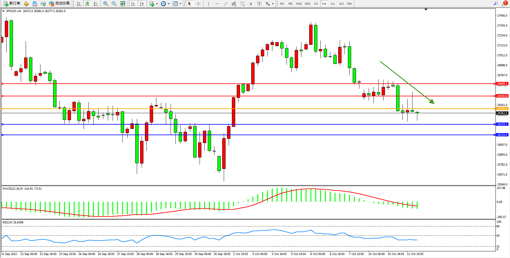 日经指数JPN225——4小时K线图显示: