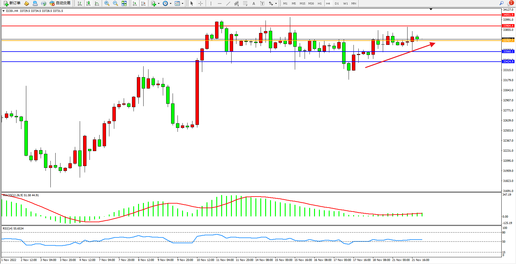 道琼斯指数DJ30——4小时K线图显示: