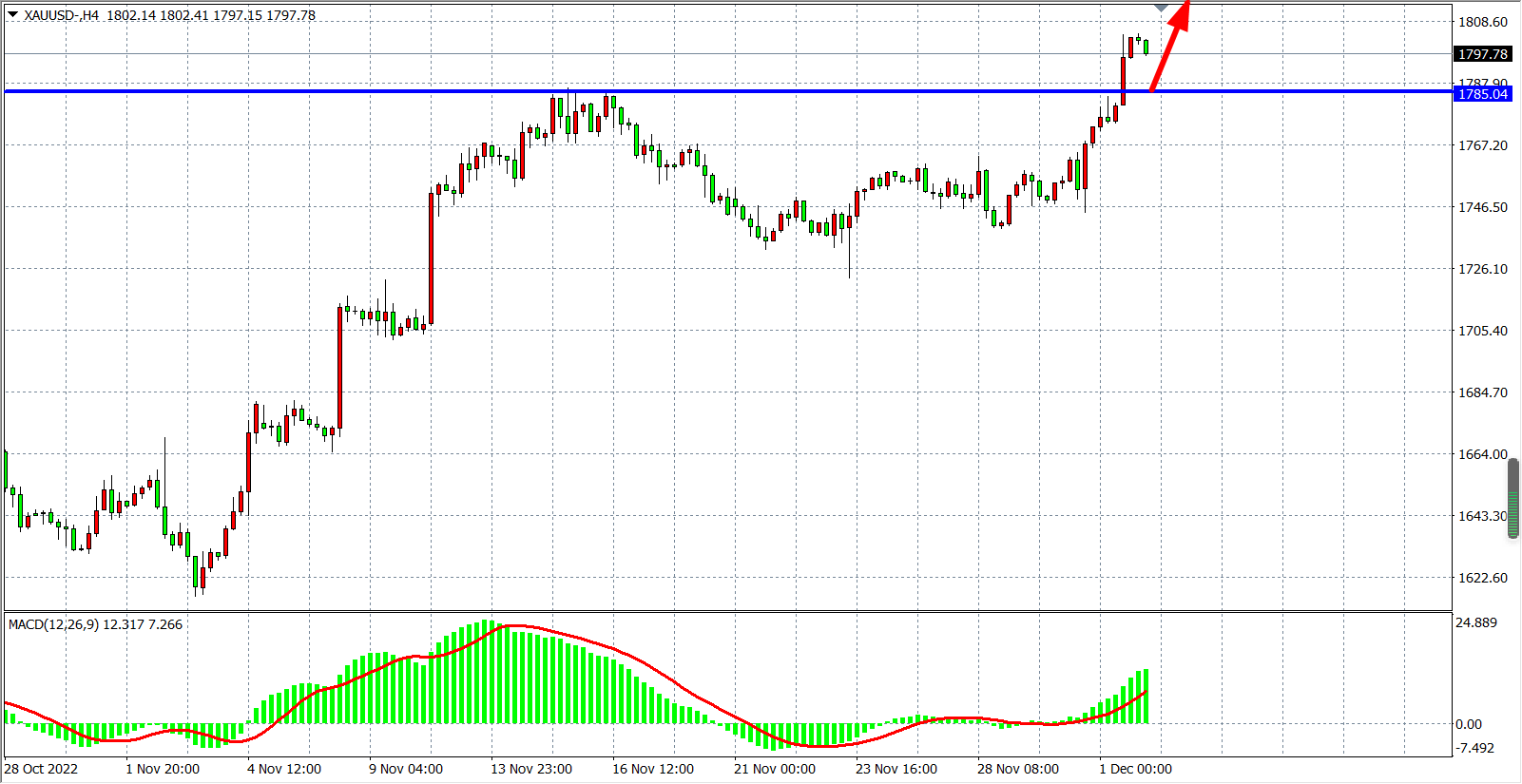 4小时图看,金价在1760之上继续走高,同时MACD在零轴之上继续放量,显示行情有望进一步走高,当前支撑已上移至1785,日内在1785之上可继续看涨为主,上方目标1800-1820。