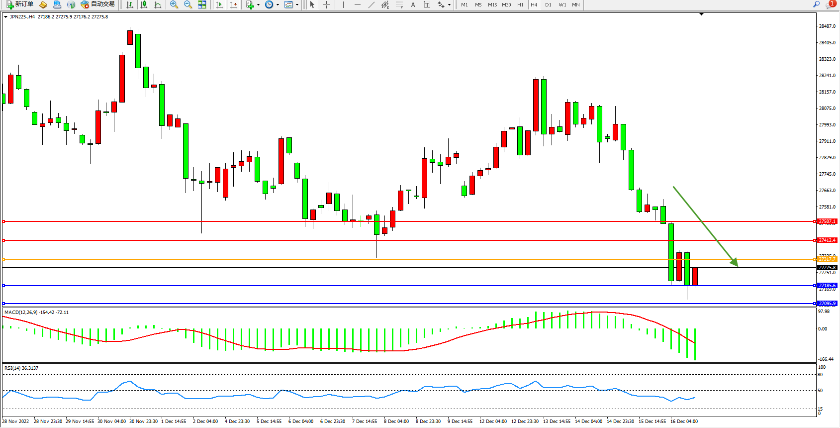 日经指数JPN225——4小时K线图显示: