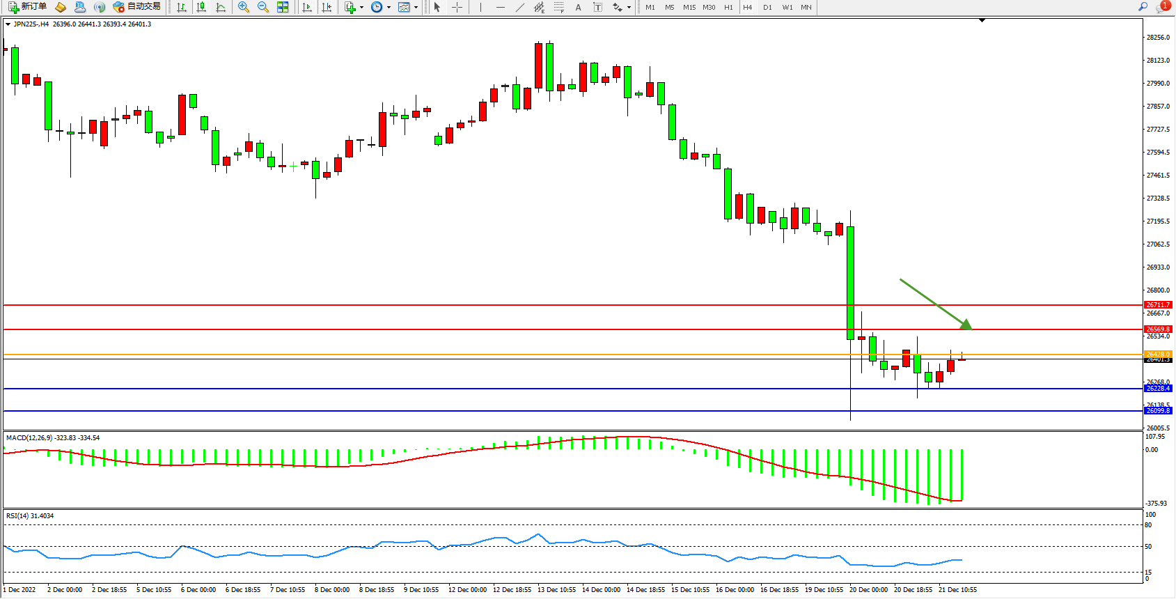 日经指数JPN225——4小时K线图显示:
