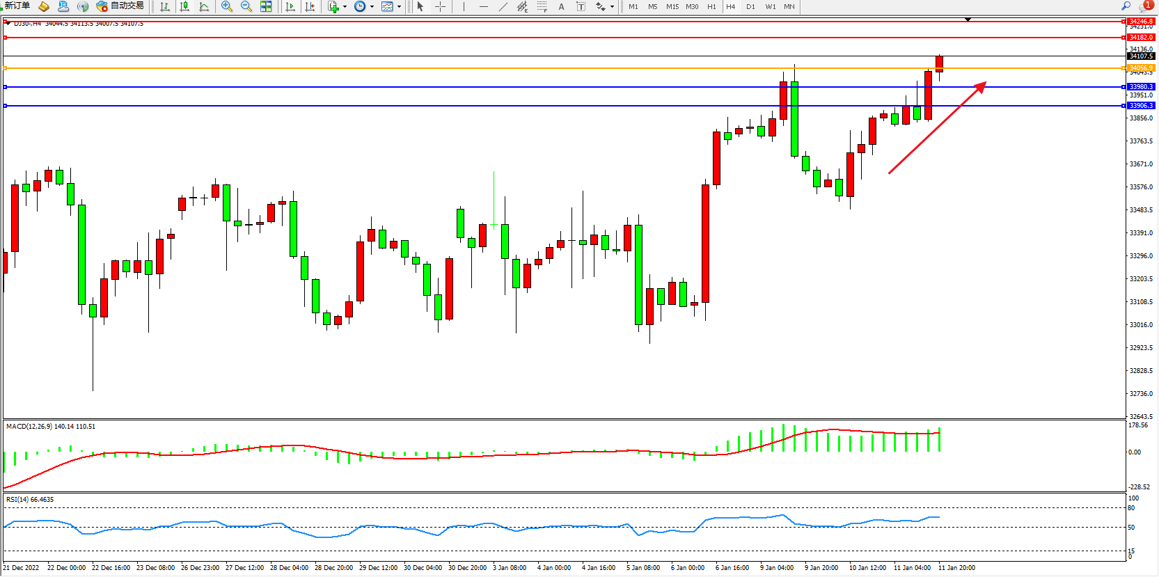 道琼斯指数DJ30——4小时K线图显示: