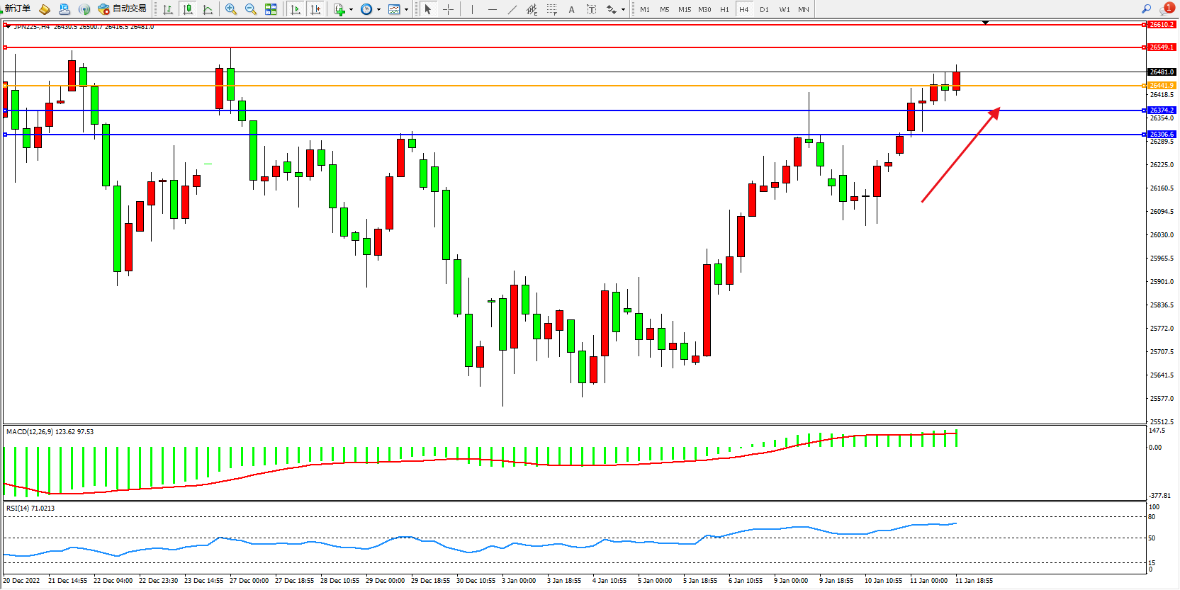 日经指数JPN225——4小时K线图显示: