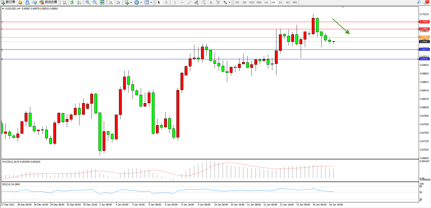 交易策略:0.69664下方看跌,目标0.69375、0.69152