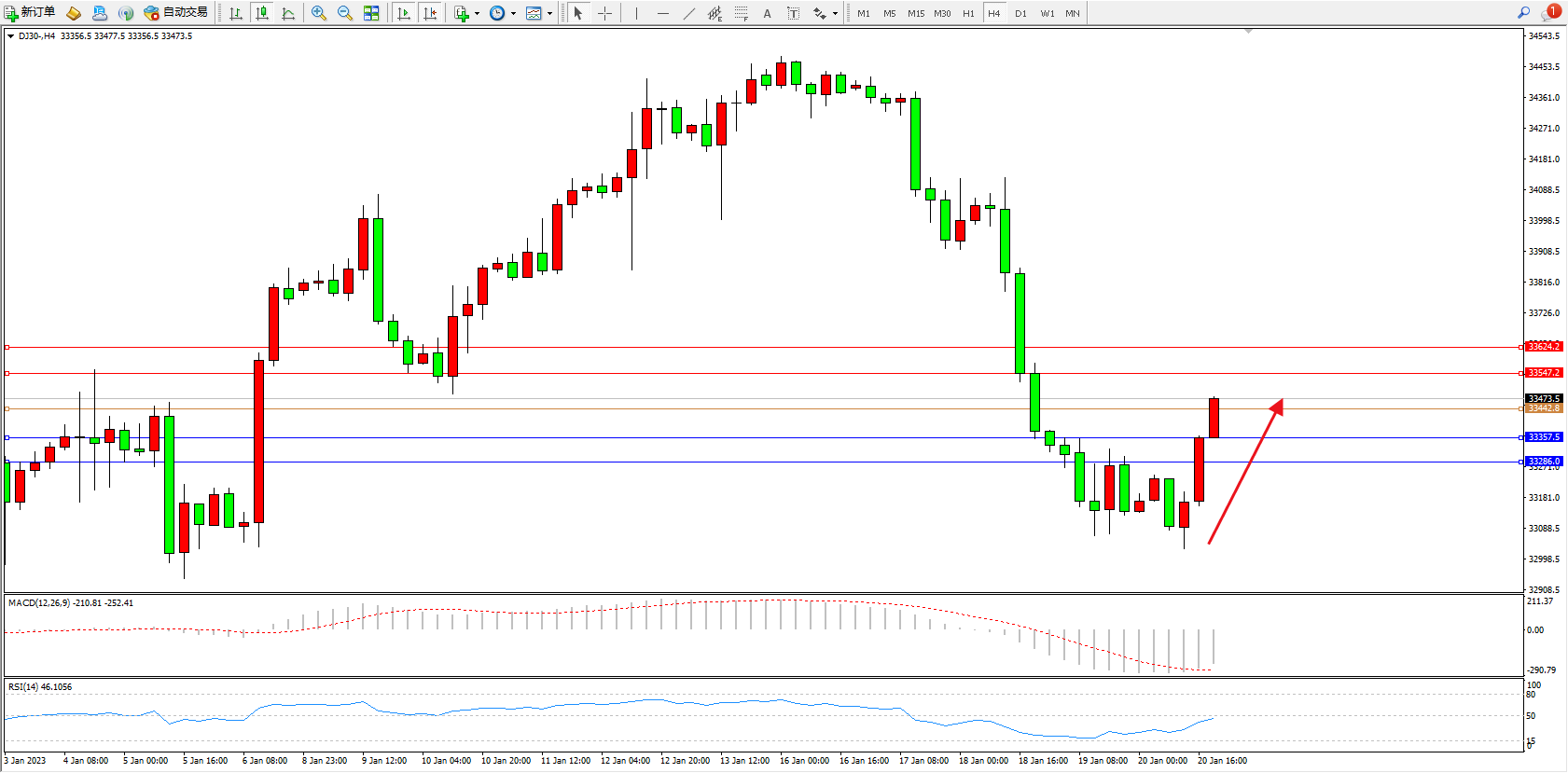 道琼斯指数DJ30——4小时K线图显示: