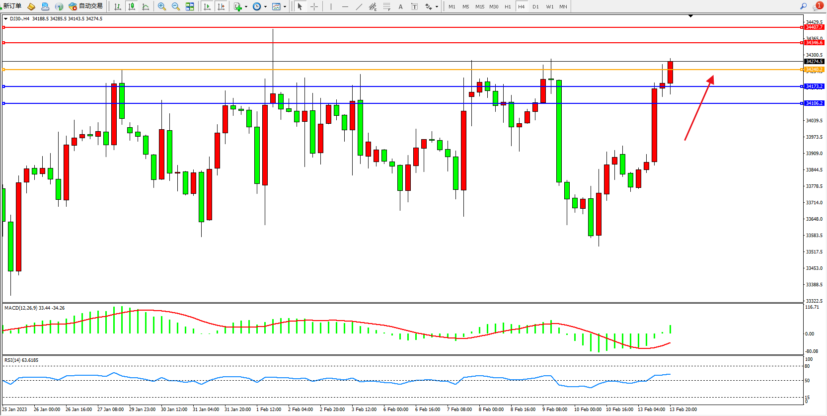 道琼斯指数DJ30——4小时K线图显示: