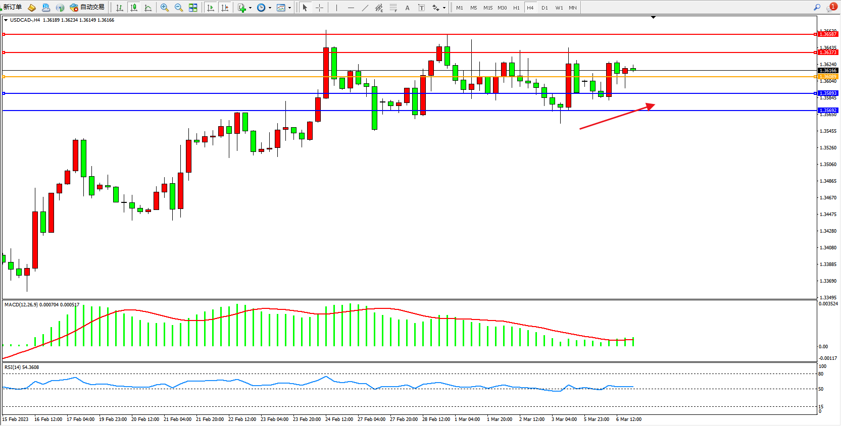 4小时图看:短期高位窄幅震荡,市场整体处于弱势整理,MACD指标处于0轴线上側徘徊,RSI指标处于50均衡线上側弱势整理;