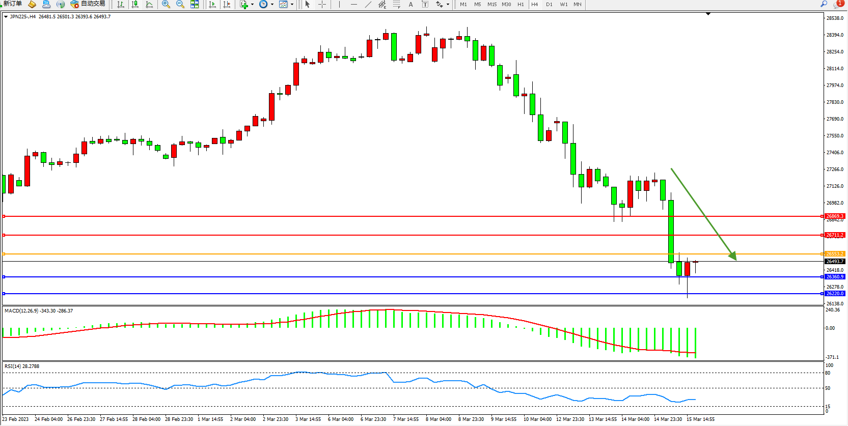 日经指数JPN225——4小时K线图显示: