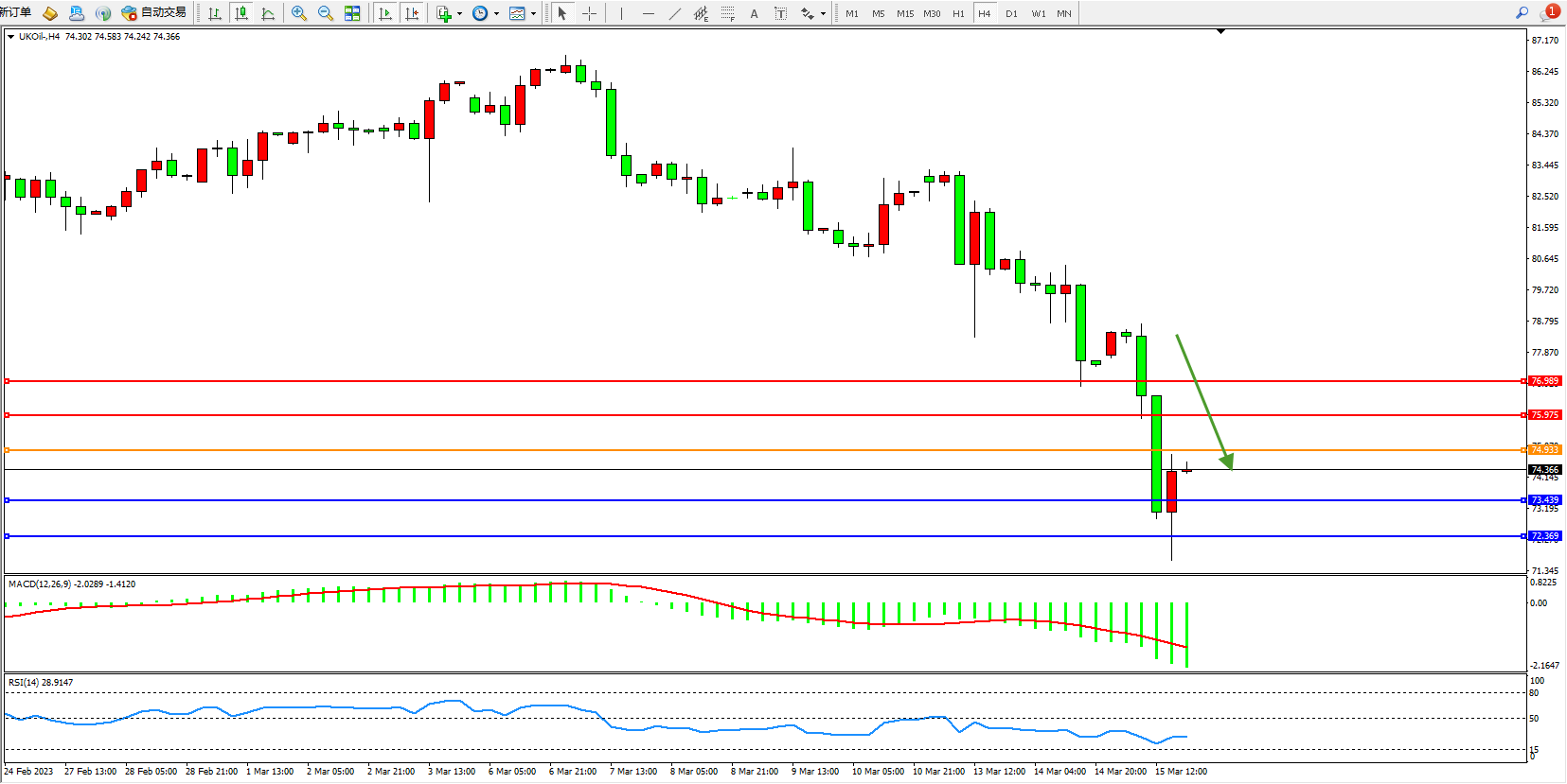 交易策略:74.933下方看跌,目标73.439 72.369