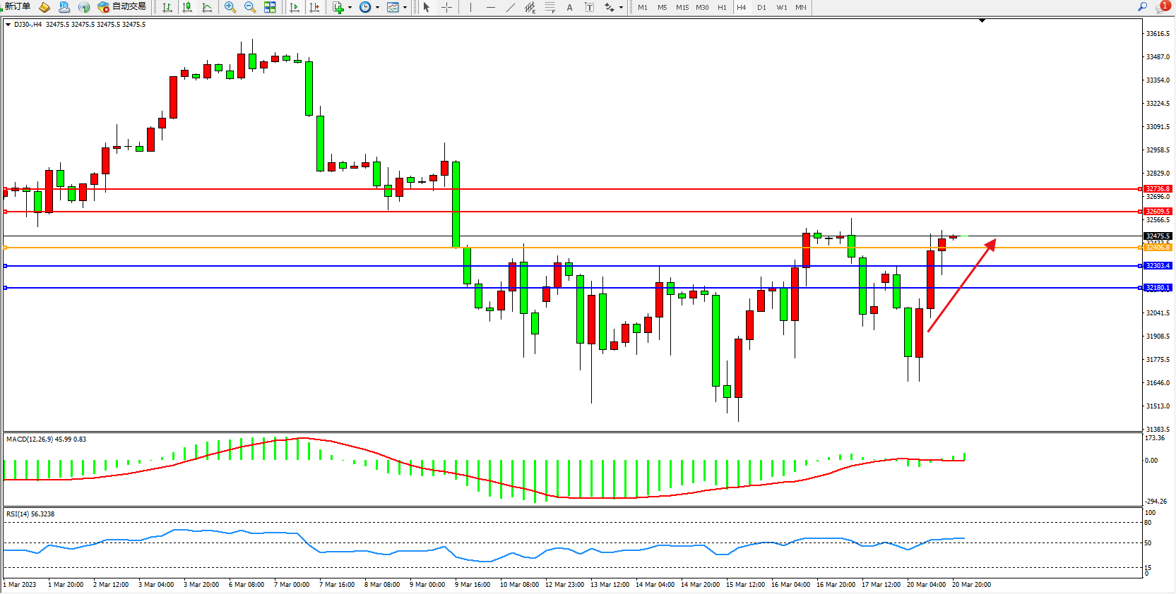 道琼斯指数DJ30——4小时K线图显示: