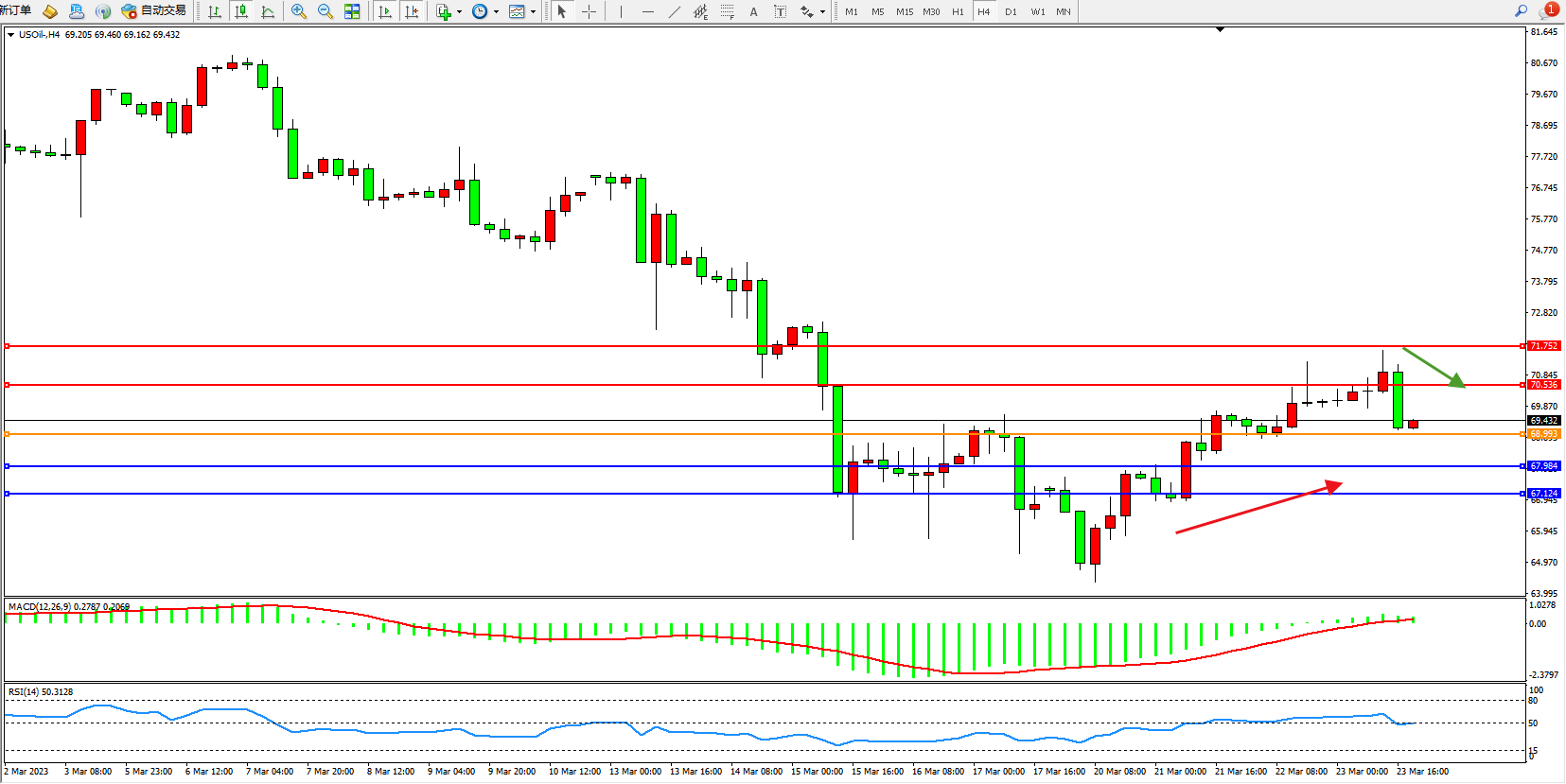 原油USOil——4小时K线图显示:
