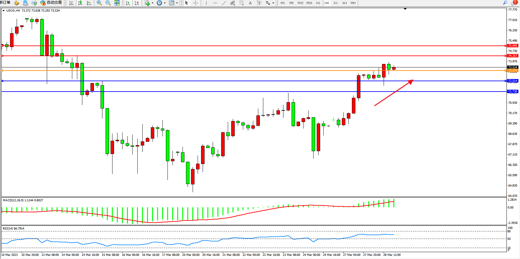 交易策略:73.274上方看涨,目标74.357 75.095