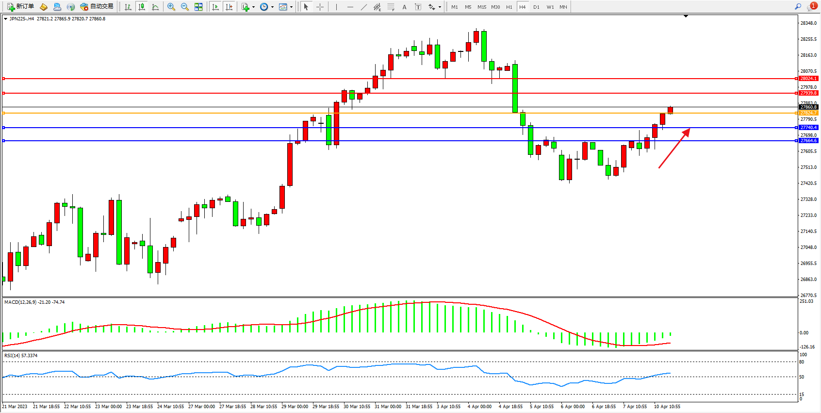 日经指数JPN225——4小时K线图显示: